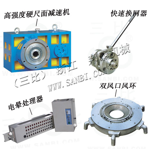 1)自動(dòng)吸料機        2)鑄鋁加熱圈           3)氣脹軸         4)旋轉模頭裝置          5)雙功位收卷機